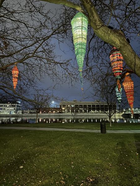 Within this installation, a series of lanterns grace the branches of two towering trees. Crafted in the likeness of glistening icicles, these lanterns are made from 100% reclaimed silk ribbon, an homage to the sustainable beauty of nature.
